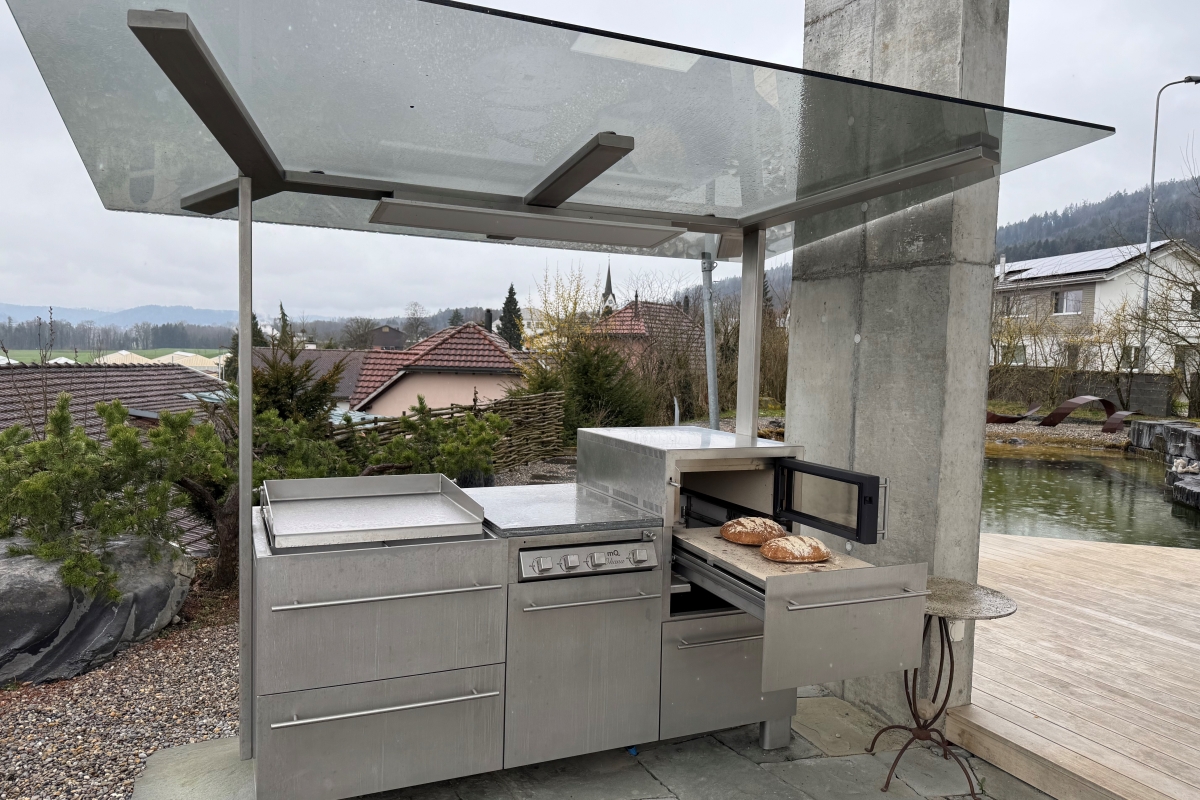 Das Modell mQ Ohana mit zwei Gasflaschen umfasst ein Grill, eine Plancha und ein Pizzaofen. Sehr angenehm ist das Glasdach, das Schutz bei Schön- und Schlechtwetter bietet.